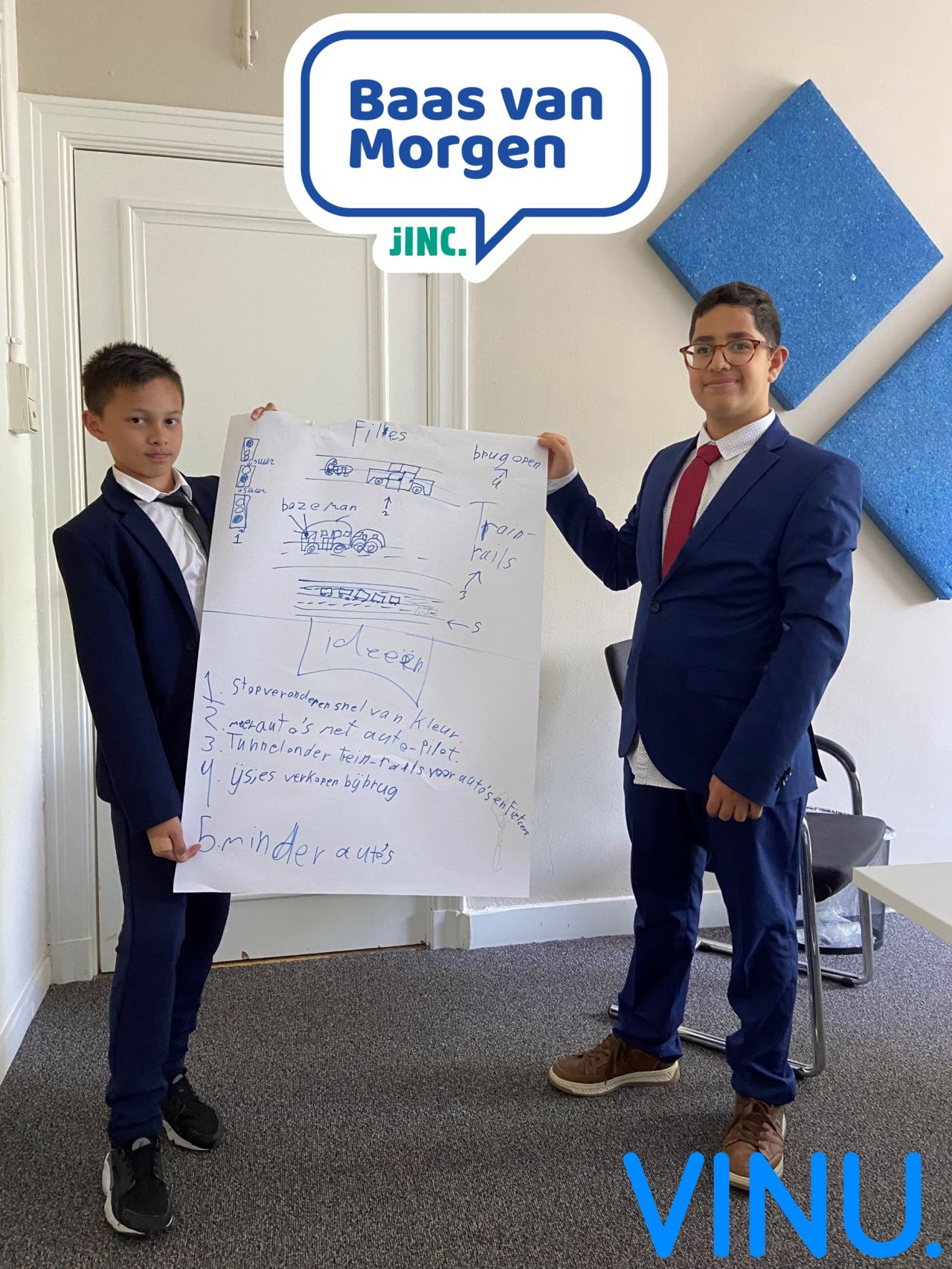 VINU is trotse partner van JINC. Deze organisatie versterkt de connectie tussen bedrijven en jongeren uit een moeilijker sociaaleconomisch milieu. Zo leren de jongeren over bedrijven, werken, en kunnen ze ontdekken wat hun passie is. Het hoogtepunt elk jaar is Baas van Morgen. Basisschoolleerlingen worden die dag gekoppeld aan een directeur en lopen ze een dag mee om kennis te maken met werken: ze ervaren hoe het is om te werken, collega’s te hebben, en beslissingen te nemen.