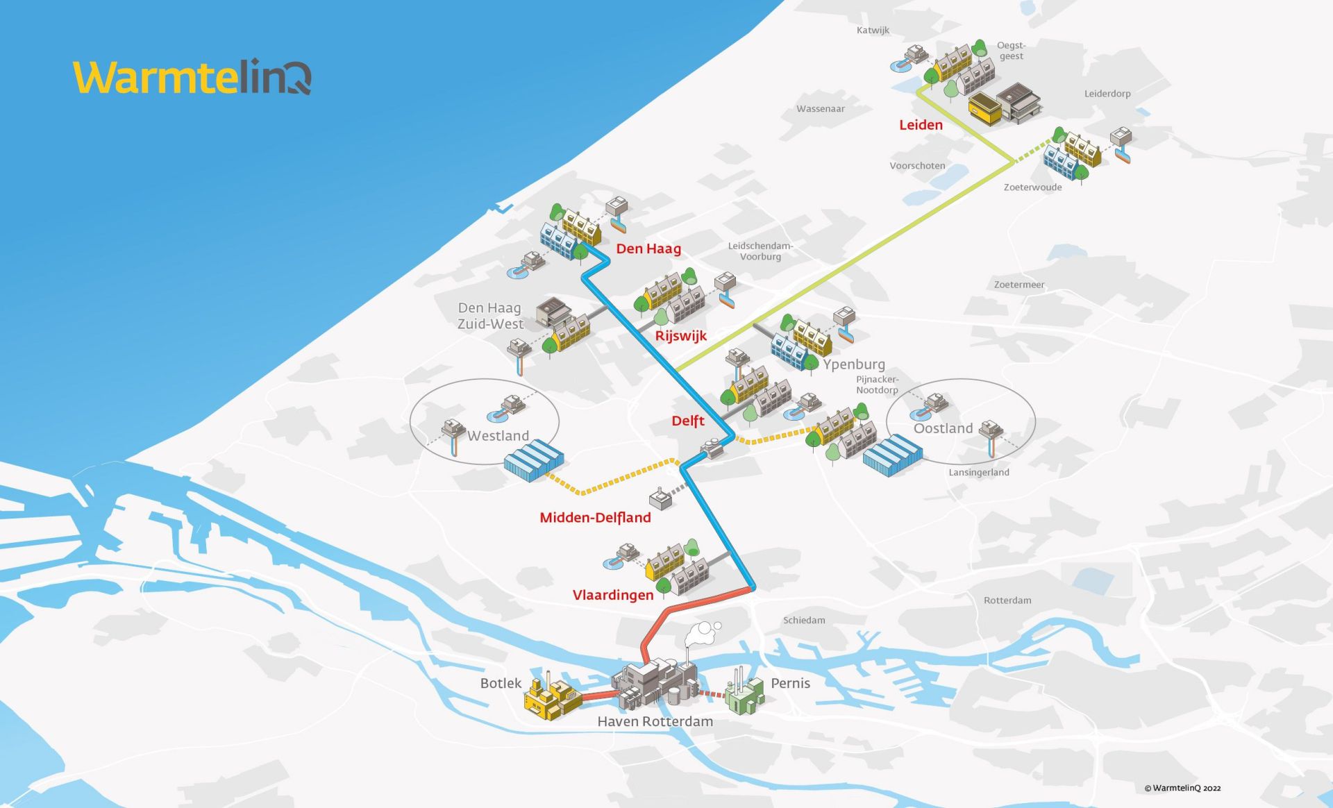 De energietransitie daagt ons uit om over te gaan van fossiele energie naar energie uit hernieuwbare bronnen. Een voorbeeld hiervan is het gebruik van warmtenetten. Een warmtenet is een netwerk van leidingen onder de grond waar warm water (bijvoorbeeld industriële restwarmte) doorheen stroomt. Het warme water verwarmt huizen en gebouwen. Warmtenetten ontlasten het elektriciteitsnet, maar hebben wel een enorme ruimtelijke impact op de ondergrond, omdat er een ondergronds leidingennetwerk moet worden aangelegd. De leidingen hebben vaak een grote afstand te overbruggen, maar eisen ook veel ruimte op in de ondergrond van woonwijken, om de warmte de woningen in te kunnen leiden. Het is inmiddels een enorme puzzel geworden om de ondergrondse infrastructuur uit te kunnen breiden. In Leiden zijn 75% van de straten niet ruim genoeg om alle kabels en leidingen te kunnen aanleggen. Een voorbeeld is het warmtenet dat Warmtelinq (Gasunie) aanlegt van de Haven van Rotterdam naar de dichtbevolkte gebieden van Delft, Rijswijk, Den Haag en mogelijk ook Leiden (zie onderstaande afbeelding, bron:warmtelinq).