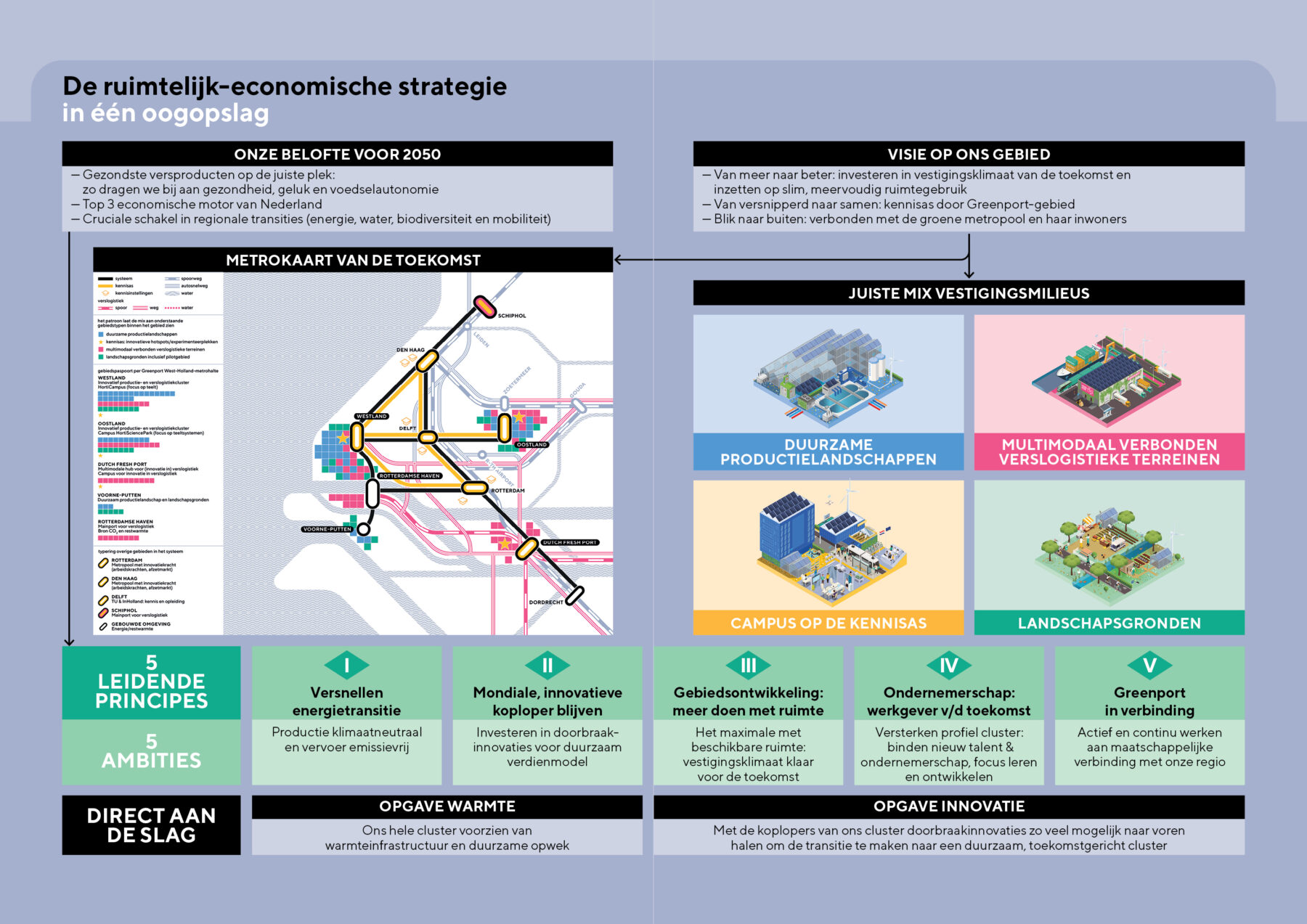 De opgaven zijn groot: succesvoorwaarden uit het verleden (goedkoop Gronings gas, beschikbare arbeidskrachten, voldoende ruimte) staan onder spanning in de drukke zuidelijke Randstad. Tegelijkertijd bewijst dit cluster al ruim een eeuw dat het met de tijd mee kan groeien. De vraag is alleen: hoe? Hoe werken we toe naar een duurzame, circulaire Greenport, die internationaal voorop loopt en regionaal sterk verbonden is met inwoners?