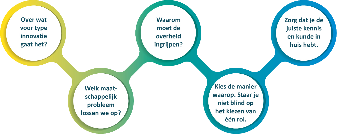 - Bepaal wie aan zet is, afhankelijk van twee hulpvragen: ‘welk maatschappelijk probleem lossen we hiermee op?’ en ‘waarom is ingrijpen van de overheid noodzakelijk?’