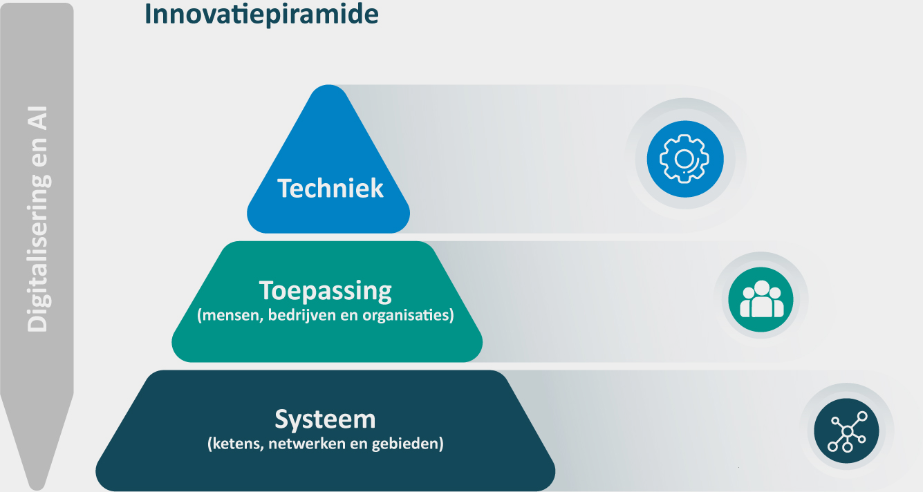 Digitalisering, en in toenemende mate kunstmatige intelligentie, lopen door alle innovatielagen heen: het is onderdeel van technische innovatie, geeft informatie voor en over nieuwe werkwijzen (meten, monitoren, bijsturen) en is een onmisbaar ingrediënt van systeeminnovaties in gebieden, netwerken en ketens.