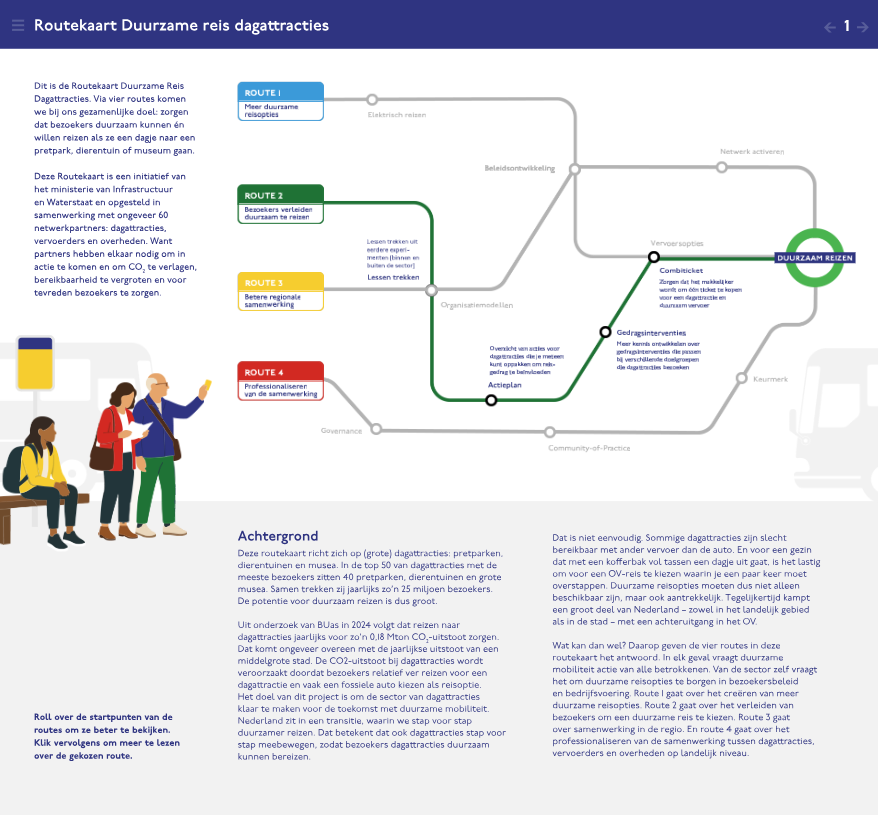 In het eerste jaar hebben we ruim 60 partijen bij elkaar gebracht die samen een routekaart hebben opgesteld. Van de Keukenhof tot de Efteling, van het Rijksmuseum tot Burgers Zoo. In die routekaart staan de ‘haltes’ voor stappen die we kunnen zetten naar duurzaam reizen. Daarnaast werken we met de sector aan demonstratieprojecten. Denk aan een zomerbuslijn voor vakantiegangers bij Attractiepark Hellendoorn. We adviseren IenW ook over stappen voor het volgende jaar.