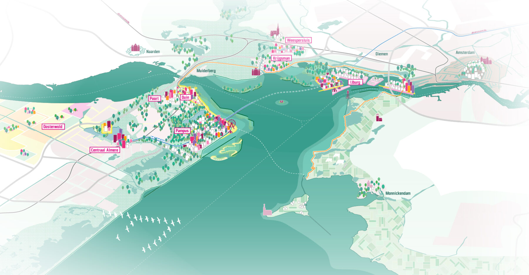 In het MIRT-onderzoek koppelden we op regionaal schaalniveau de gebiedsontwikkeling aan werken, natuur en bereikbaarheid. Zo hebben we een doorbraak voor Amsterdam Bay Area gecreëerd en blijken 100.000 woningen aan het IJmeer mogelijk.